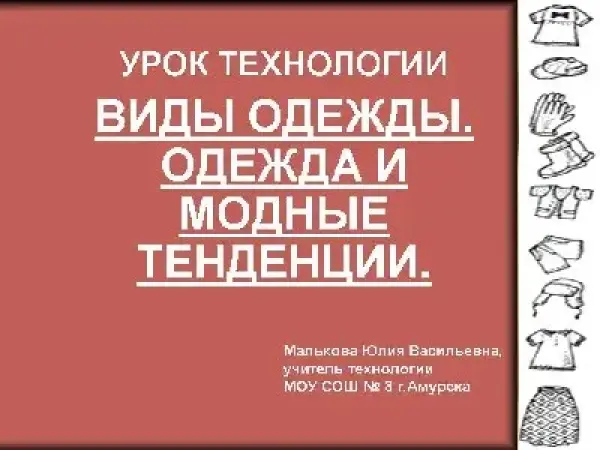 Новизна урока заключается в знакомстве пятиклассниц с историей одежды, ориентации на современные, востребованные профессии: модельер, кутюрье, дизайнер. Согласно программе И.А. Сасовой «Технология 5–8-е классы» урок на тему «Виды одежды. Одежда и модные тенденции» проводится в 5-х классах, что очень своевременно для этой возрастной категории учащихся.