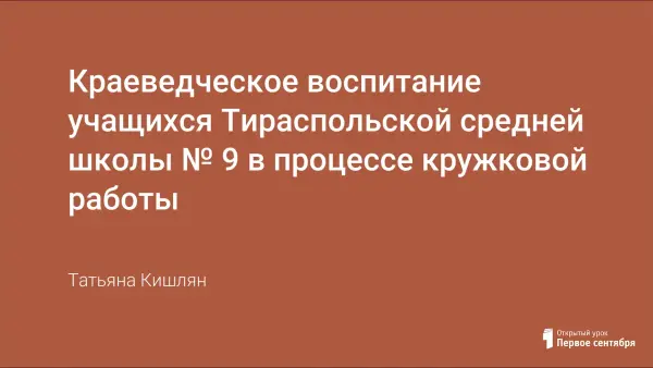 Подготовка молодежи к жизни в условиях многонациональной и мультикультурной среде вызывает необходимость поиска современных решений культурных проблем образования в Приднестровье. Предложенная система краеведческого образования помогает ответить на следующие вопросы: для чего следует изучать свой край? Что изучать? Каким образом организовать достижение намеченной цели? Как преподавать краеведческий материал?