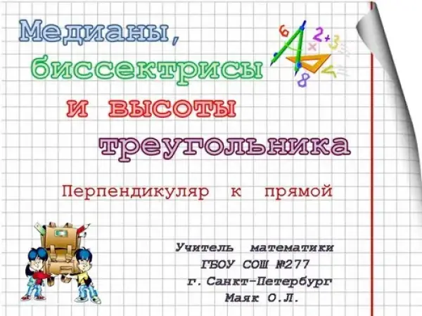 На уроке вводятся понятия "перпендикуляр к прямой", "медиана", "биссектриса" и "высота треугольника", выполняются построения в треугольнике. Презентация наглядно преподносит материал, экономит время, помогает повторить изученный материал. С этими понятиями учащиеся встречаются впервые, выполнение построений вызывает трудности. Наглядный пример помогает правильно выполнить работу и закрепить знания.