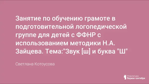 В работе представлено занятие в подготовительной логопедической группе для детей с ФФНР (фонетико-фонематическим недоразвитием речи) с использованием методики Н.А. Зайцева на тему "Звук [ш] и буква "Ш". Занятие насыщено разнообразным занимательным речевым материалом, построено по принципу "от простого к сложному" и может быть использовано для профилактики дисграфии и дислексии у дошкольников и младших школьников.
