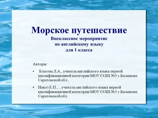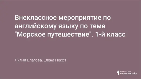 Данное внеклассное мероприятие по английскому языку предназначено для учащихся 1-х классов. Занятие проводится в виде морского путешествия, во время которого первоклассники выполняют ряд заданий. На каждом этапе дети получают «ключи» к выполнению заключительной части путешествия.