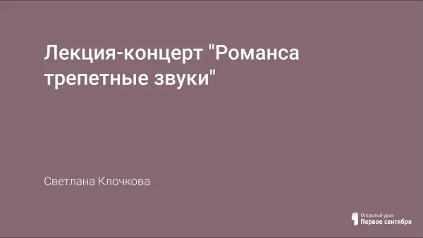 Лекция-концерт знакомит слушателей с некоторыми образцами русской романсовой классики XIX–XX вв., историей их создания и исполнения. В лекции использованы отрывки из стихотворений русских поэтов. Предлагаемый материал может быть адресован как представителям старшего поколения, так и молодежи. В заключение лекции-концерта слушателям предлагается совместное исполнение одного романса Марка Фрадкина из кинофильма "Простая история".