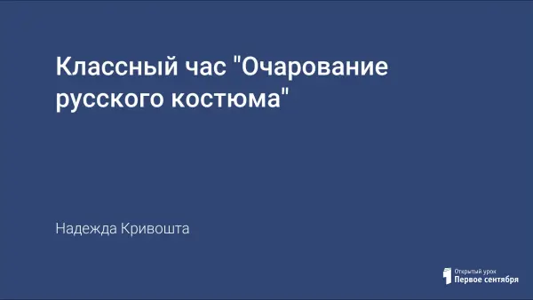 Основная идея классного часа - показать красоту русского народного костюма. В ходе классного часа рассматриваются два вида русского костюма: южный русский и северный русский, рассматриваются основные отличия этих видов женского костюма, цвета и ткани. Представлены женские костюмы: воронежский, смоленский, тамбовский, рязанский, великоустюжский, каргопольский.