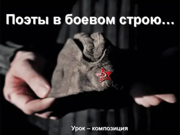 Урок-композиция посвящен поэтам, участникам грозовых событий Великой Отечественной войны. Он включает в себя 3 раздела. В первом говорится о поэтах, которые с первых дней войны сражались с врагом, стихами, мобилизуя народ на войну. Второй раздел посвящен поэтам, погибшим на войне, а третий ‒ памяти, которая выражена в послевоенных стихах.