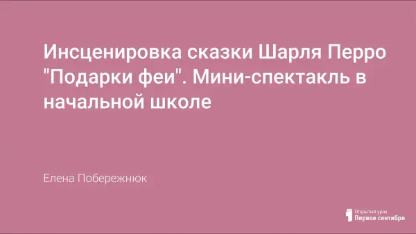 Инсценировка одноименной сказки Ш. Перро «Подарки феи» предназначена для внеклассной работы по литературному чтению в начальной школе. Повествование при инсценировании переводится в диалог и побуждает учеников к творческому «воплощению» литературных образов, обостряет внимание к художественному тексту. Происходит активизация читательского восприятия, развивается воображение, воспитывается сопереживание.