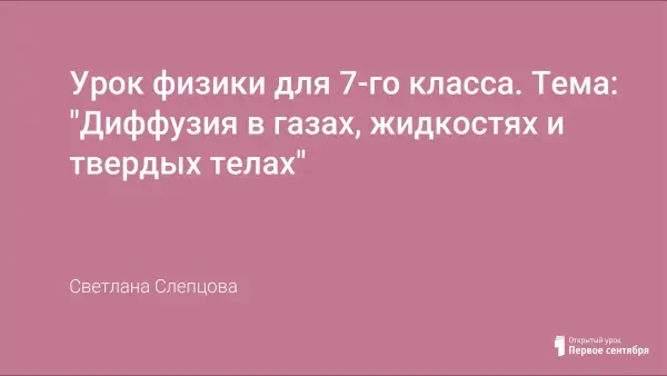 Урок разработан для учащихся 7-го класса. По учебнику А.В.Перышкина. На данном уроке рассматриваем явление диффузии и условия протекания диффузии. Урок позволяет познакомить учащихся с методом исследований, научить делать выводы на основании полученных результатов.