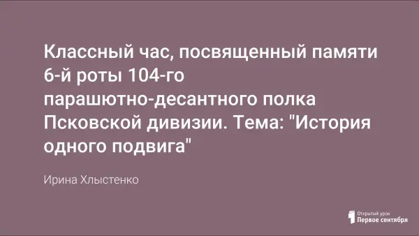 Классный час посвящен памяти воинов 6-й роты 104-го парашютно-десантного полка Псковской дивизии. Своей целью ставлю познакомить учащихся с подвигом Дмитрия Кожемякина, героя, именем которого названа одна из улиц нашего города.