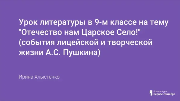 Лицейский период жизни А.С. Пушкина представляет для учащихся наибольший интерес, ведь девятиклассники - ровесники Пушкина-лицеиста. Урок рассчитан на 2 академических часа, т.к. содержит обширный материал по указанному периоду жизни и творчества поэта.