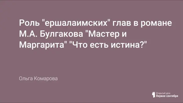 Урок "Что есть истина?" посвящен трактовке библейского сюжета в романе М.А. Булгакова "Мастер и Маргарита". Во время учебного занятия развивается умение анализировать произведение через сопоставление канонических религиозных текстов и романа "Мастер и Маргарита". Особое внимание уделяется формированию творческого воображение и ассоциативно - логическое мышление учащихся.