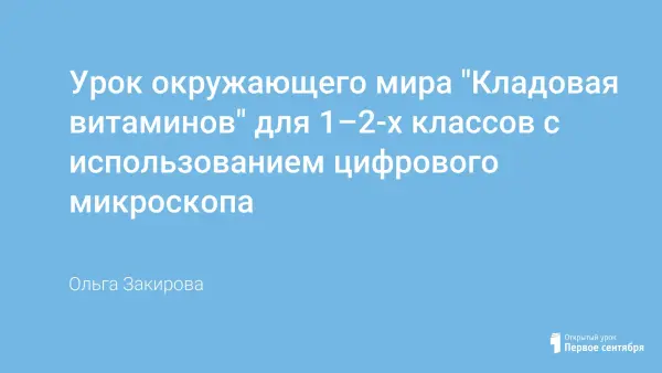 В разработке урока "Кладовая витаминов" описан этап работы с цифровым микроскопом, направленный на формирование интереса учащихся к учебной и научной деятельности. Учитель выступает в качестве наставника, руководителя. Нестандартное размещение учащихся и задания урока приучают школьников работать в группах, развивают умение слушать и слышать друг друга.