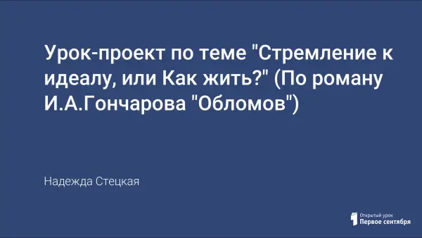 Цель: проанализировать роман И.А. Гончарова "Обломов": сопоставить Обломова с героями народных сказок; прочитать фрагменты статей философов и литературоведов К.Д. Кавелина "Наш умственный строй", И.А. Ильина "Творческая идея России", Д.С. Лихачева "О национальном характере русских"; показать какие черты русского типа характера и европейского отмечают в своих статьях русские философы и литературоведы; сопоставить образы главных героев Обломова и Штольца и выявить положительные и отрицательные черты характера; показать, каким представлял идеального человека И.А. Гончаров в романе «Обломов»; развивать познавательный интерес школьников в исследовательских проектах; формировать умение презентовать конечный результат, высказывать свои мысли связно и логично; воспитывать активную жизненную позицию.