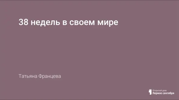 Урок "38 недель в своем мире" ‒ рассказ о тех сложных и необычайно важных процессах, которые предшествуют рождению ребенка. По ходу урока ребята самостоятельно составляют "кодекс" здорового образа жизни будущих родителей и приходят к пониманию того, что каждый делает свою жизнь сам и каждый в ответе за собственное счастье.