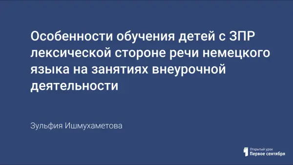 Обучение иностранному языку детей с ЗПР имеет определённые трудности. Работая с такими детьми необходимо и очень важно учитывать их физиологические и психические особенности. Добиться положительных результатов в обучении детей с ЗПР немецкому языку можно, сместив акцент с практического владения языком на общее развитие детей, предоставив им право на бесконфликтное обучение.