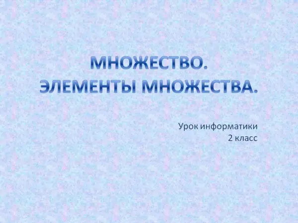 Урок информатики во 2-м классе. Учащиеся знакомятся с такими понятиями, как «множество» и «элементы множества». Все задания и игры направлены на усвоение и закрепление новых понятий. Презентация к уроку наглядно демонстрирует работу с элементами множества. Небольшая самостоятельная работа в конце урока в виде тестовых заданий позволяет увидеть степень усвоения нового материала.