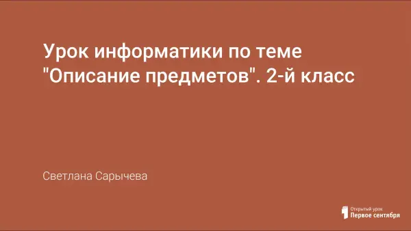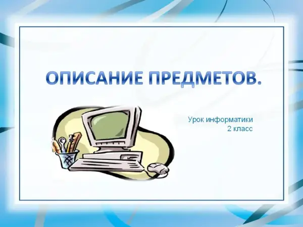 Урок информатики по программе А.В. Горячева изучает и первично закрепляет новые знания. Ученики учатся описывать и определять предметы через их признаки. Все задания и игры направлены на усвоение понятия «описать предмет», а также на закрепление изученных признаков предмета. Небольшая самостоятельная работа в конце урока в виде тестовых заданий контролирует усвоение материала. Презентация к уроку наглядно демонстрирует все задания