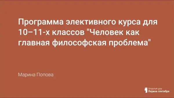 Элективный курс "Человек как главная философская проблема" рассчитан на 17 часов, углубляет и конкретизирует содержание предметных тем базового курса "Обществознание" в средней школе. Данный элективный курс дает возможность расширить знания обучающихся о человеке, более глубоко осмыслить проблемы сущности и существования человека в современном мире.
