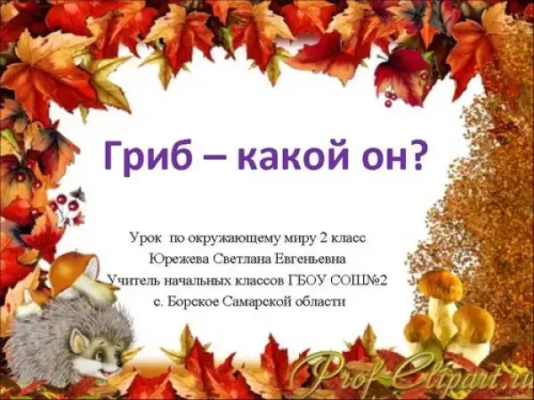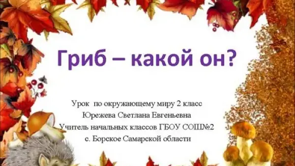 Цель урока: дать детям понятие о грибах как особом царстве живой природы, познакомить с различными видами грибов и их строением, вместе с учениками вывести правила сбора грибов.
