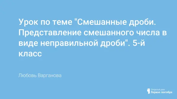 Урок математики по теме «Смешанные дроби. Представление смешанного числа в виде неправильной дроби» – урок усвоения новых знаний. На предыдущих уроках учащиеся познакомились с понятием "дробь", "правильная и неправильная дробь", научились складывать обыкновенные дроби. Цель урока: знакомство с понятием смешанного числа и алгоритмом представления смешанного числа в виде неправильной дроби. На последующих уроках ученики учатся складывать, вычитать смешанные дроби.