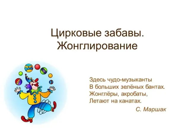 Задачи занятия: расширить знания детей о цирке: познакомить с историей, с цирковыми профессиями; развивать воображение, чувство ритма, темпа; раскрыть правила постановки корпуса, описать комбинации жонглирования; воспитывать интерес к занятиям цирковым искусством, развивать волю и упорство.