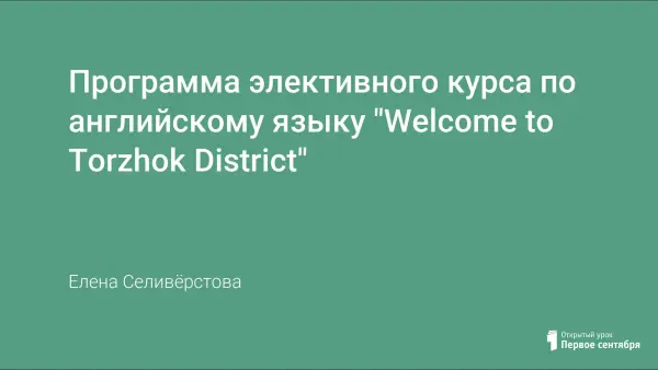 Программа элективного курса может занять достойное место в предпрофильной подготовке учащихся в многовариантной сетке углубленного изучения английского языка. Цель: изучение особенностей родного края средствами иностранного языка. Содержание предлагаемого курса и подача учебно-познавательного материала обеспечивают эффективный процесс изучения ИЯ как средства общения и приобщения к духовному наследию русского народа.