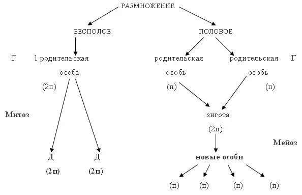 Учащиеся: Бесполое и половое размножения происходят за счет разных типов клеток и основан на разных способах их деления..
