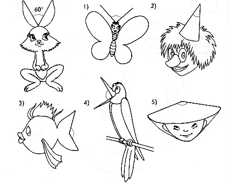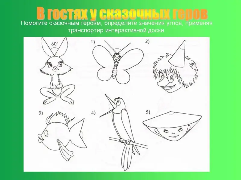 Задание № 2. Помогите сказочным героям, определите значения углов, применяя транспортир интерактивной доски.