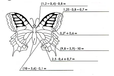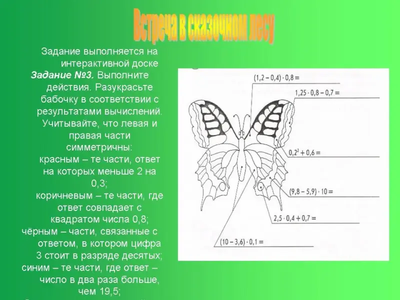 Задание № 3. Выполните действия. Разукрасьте бабочку в соответствии с результатами вычислений. Учитывайте, что левая и правая части симметричны: