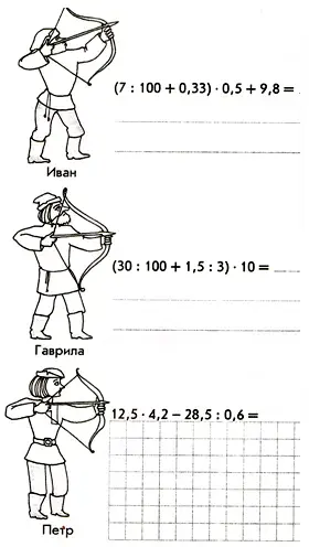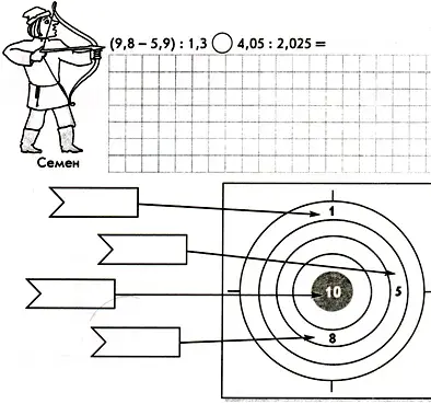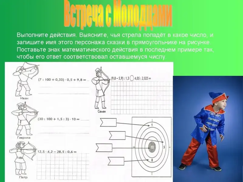 Выполните действия. Выясните, чья стрела попадёт в какое число, и запишите имя этого персонажа сказки в прямоугольнике на рисунке. Поставьте знак математического действия в последнем примере так, чтобы его ответ соответствовал оставшемуся числу.