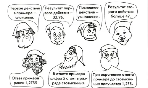 Вот и подошло к концу наше путешествие. Наш походный дневник почти готов. Не хватает только последней странички, зовущей к новым странствиям. Помогите Гномам подружиться с математикой. Выполните действия: 2,315 - (8,7 + 10,3 *3,2)*0,025. Прочитайте высказывания гномов. Укажите, какие высказывания, связанные с данным примером, истинные, а какие ложные. Разукрасьте колпачки гномов, которые говорят правду в зелёный цвет, а тех, которые допускают ошибки - в красный.