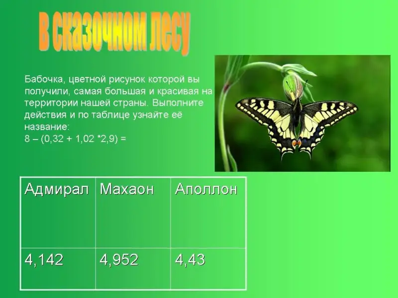 Бабочка, цветной рисунок которой вы получили, самая большая и красивая на территории нашей страны. Выполните действия и по таблице узнайте её название: