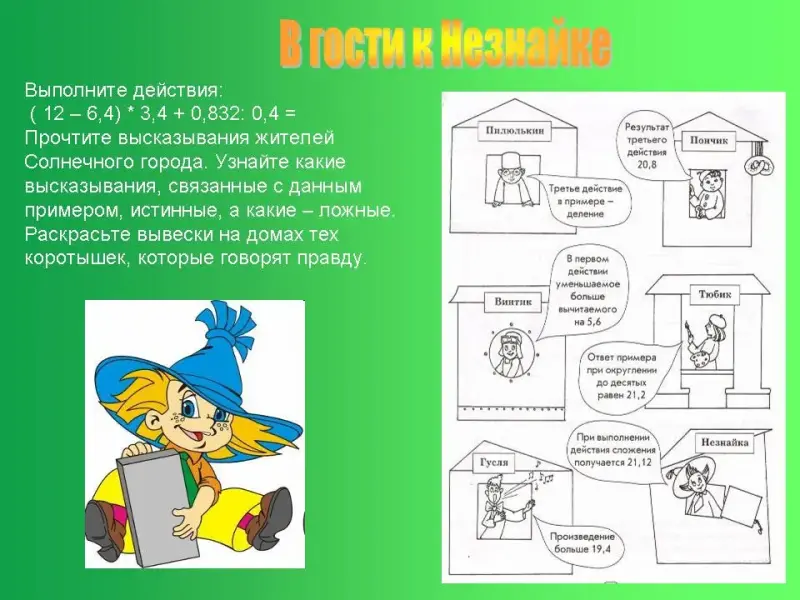 Прочтите высказывания жителей Солнечного города. Узнайте какие высказывания, связанные с данным примером, истинные, а какие - ложные. Раскрасьте вывески на домах тех коротышек, которые говорят правду.
