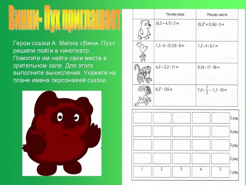 Задание № 6. Герои сказки А. Милна "Вини- Пух" решили пойти в кинотеатр. Помогите им найти свои места в зрительном зале. Для этого выполните вычисления. Укажите на плане имена персонажей сказки. (Задание выполняется на интерактивной доске.)