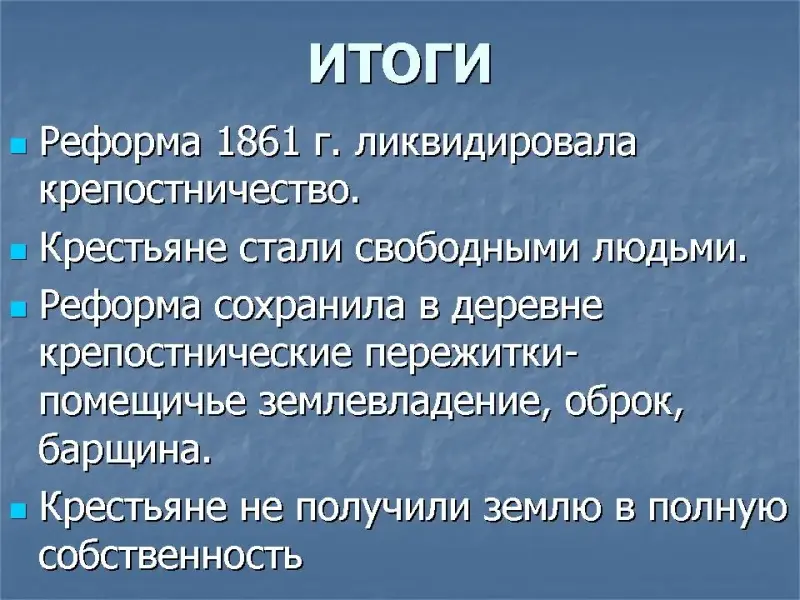 При показе следующих слайдов, отражающих суть и смысл крестьянской реформы, учитель может так же более или менее подробно остановиться на основных моментах темы. Например, побудить учащихся поразмыслить и ответить на следующие вопросы: