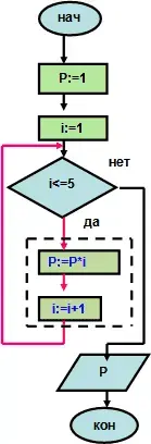 Шаг седьмой: при i равном пяти проверяем условие пять меньше или равен пяти, да ,условие истинно, значит Р присваивается значение двадцать четыре умноженное на пять, будет сто двадцать. Для i: пять плюс один, будет шесть.