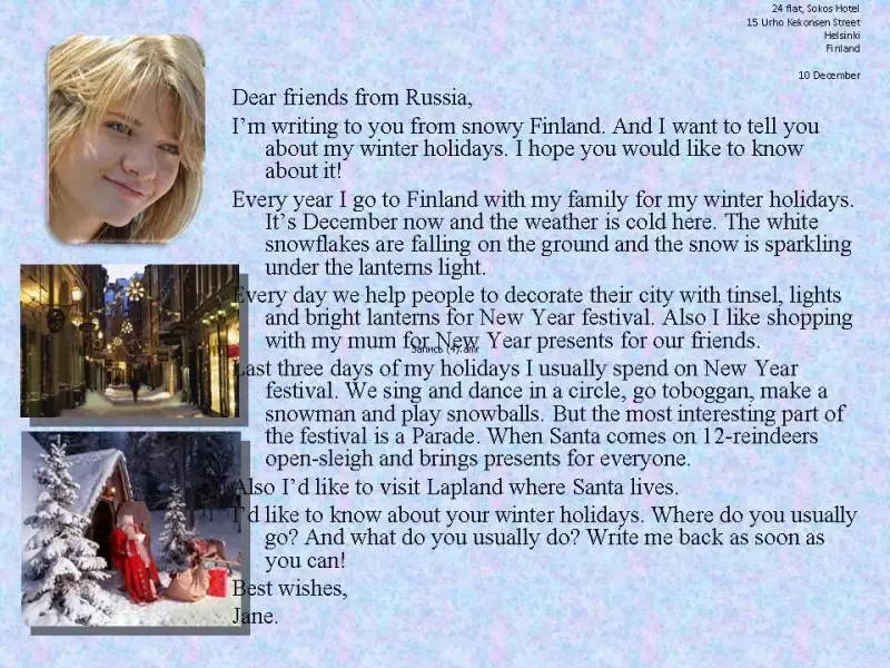 I'm writing to you from snowy Finland. And I want to tell you about my winter holidays. I hope you would like to know about it!