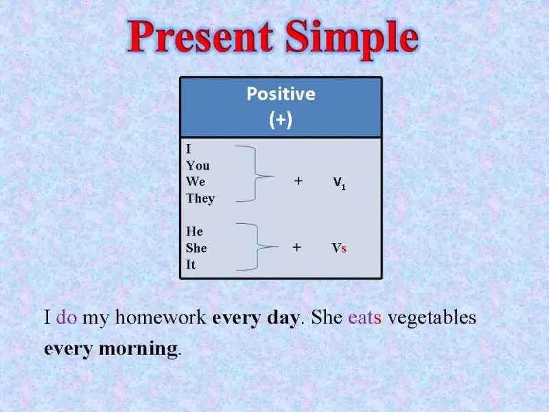 T: Yes. We use the Present Simple when we speak about the action which repeats periodically. And how do we build the positive sentences in the Present Simple? (Click.)