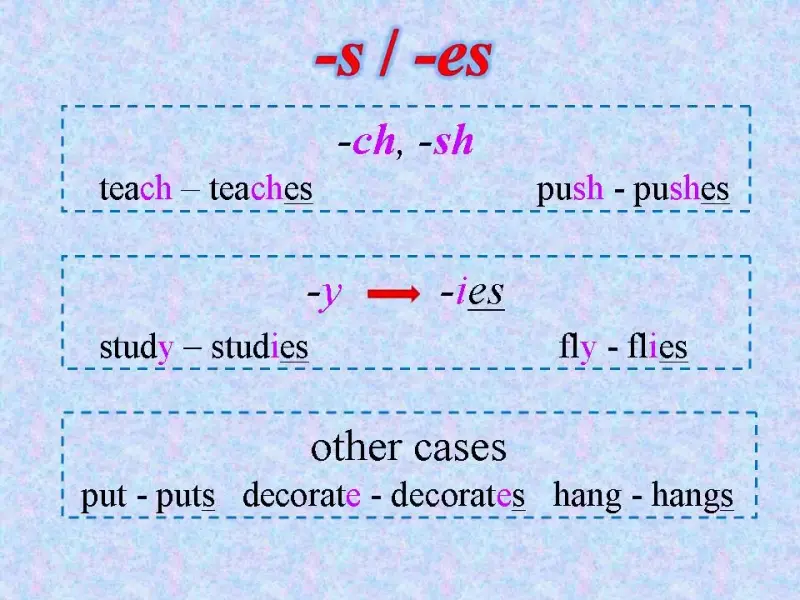 T: Right. Look at the examples in the screen: "teach - teaches, push - pushes". Ребята, а если слово заканчивается на букву -y какое мы добавляем окончание?
