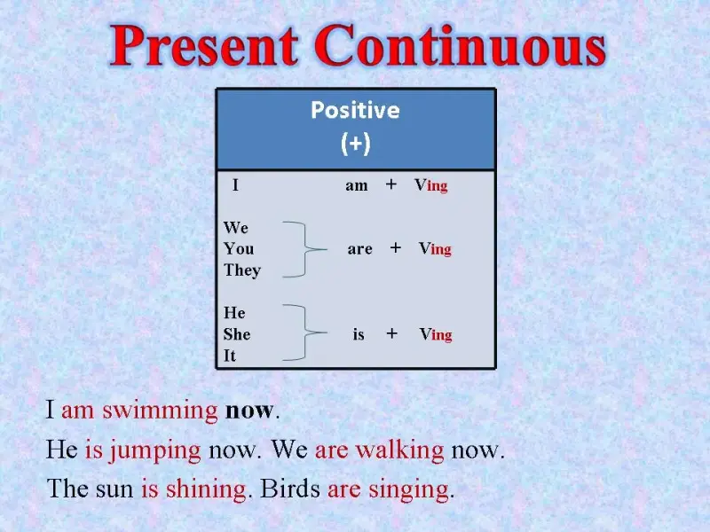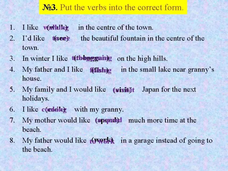 Present Simple (affirmative sentence) Present Continuous (affirmative sentence) I like +Ving I 'd like + to V1 |