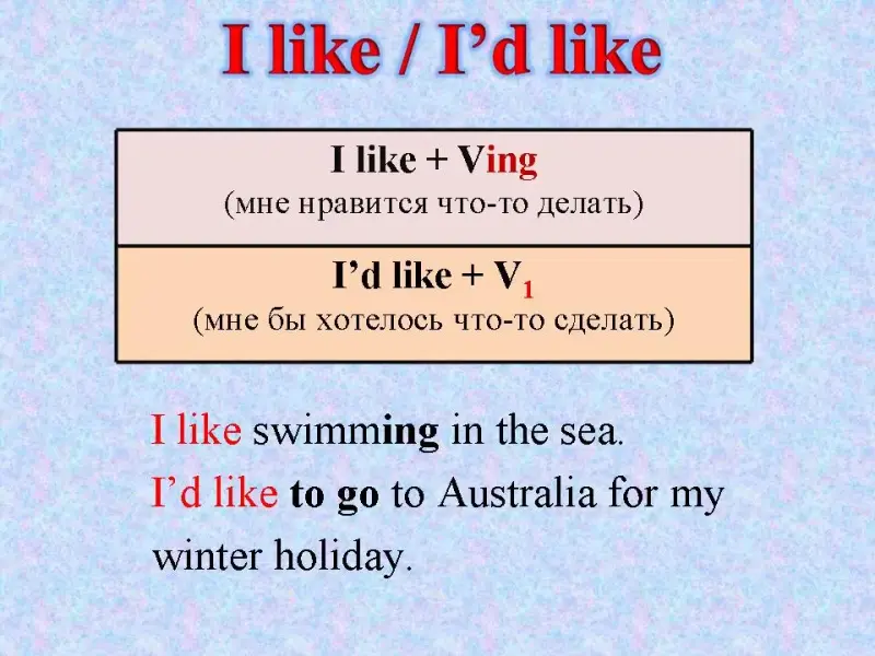 T: Yes, you're absolutely right! (Click.) Look at the examples in the screen: "I like swimming in the sea" - мне нравится плавать в море, and "I'd like to go to Australia