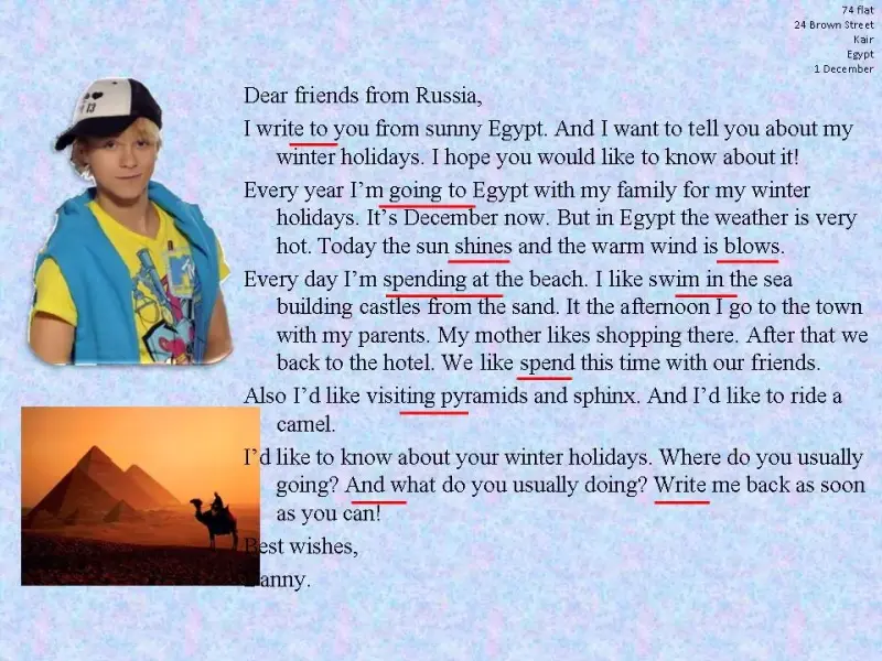 I am writing to you from sunny Egypt. And I want to tell you about my winter holidays. I hope you would like to know about it!