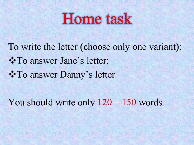 T: At home, I want you to answer Jane's or Danny's letter. You should write about your winter holidays. Where do you usually go and what you usually do. Is it clear?