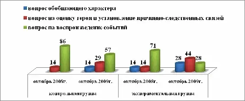 По данным исследования можно сделать вывод: большинству учащихся контрольной группы сложно полноценно воспринимать текст художественного произведения. Большую долю вопросов составляют вопросы на воспроизведение событий.