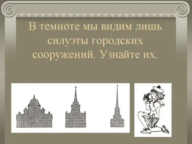 VI. В темноте мы видим лишь силуэты городских сооружений. Узнайте их по очертаниям (учащиеся работают в группах с раздаточным материалом) (слайд № 6)
