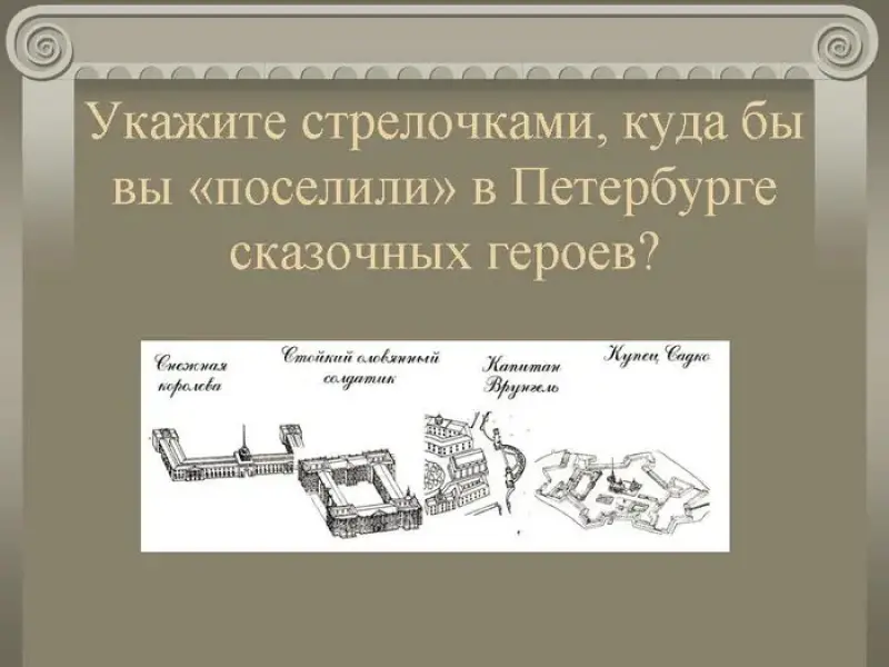 VII. Укажите стрелочками, куда бы вы "поселили" в Петербурге сказочных героев? (слайд № 7)