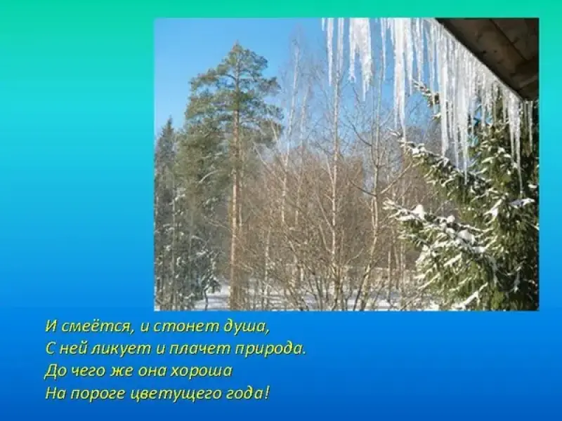 Учитель: Но сейчас самое прекрасное время года - весна: обновление природы, рождение новой жизни, возрождение света и красоты… Поэтому к сегодняшней встрече мы подготовили, в основном, стихи о природе: Как быстро Природа весной оживает!