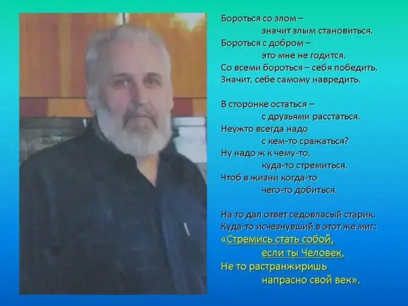 Учитель: Вот сколько званий и регалий у этого человека! НО самое главное, что, при всём при том, он живёт совсем рядом - в Белогорске, и он очень простой и доступный человек. Слайд 4