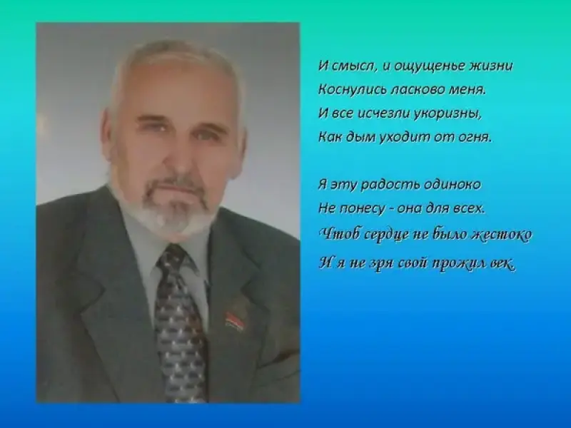 Учитель: С раннего детства пристрастился к чтению. Интересовался не только прозой, но и поэзией, но первое свое стихотворение написал в 2000 году в честь юбилея жены Зинаиды Владимировны. С тех пор вот уже девятый год о том, что его волнует, пишет стихи (уже подготовлен для печати второй сборник стихотворений). Слайд 6