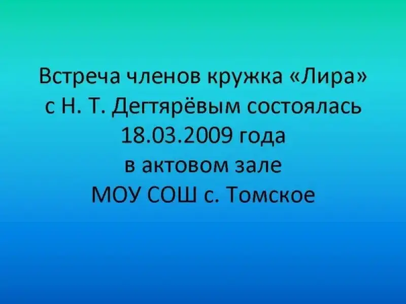 Учитель: Не сомневаемся, что стихи Николая Трифоновича Дегтярева не оставили Вас равнодушными. И сейчас я хочу предоставить слово автору этих замечательных стихов. Слайд 41