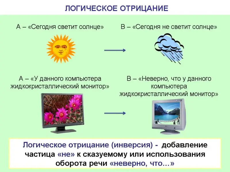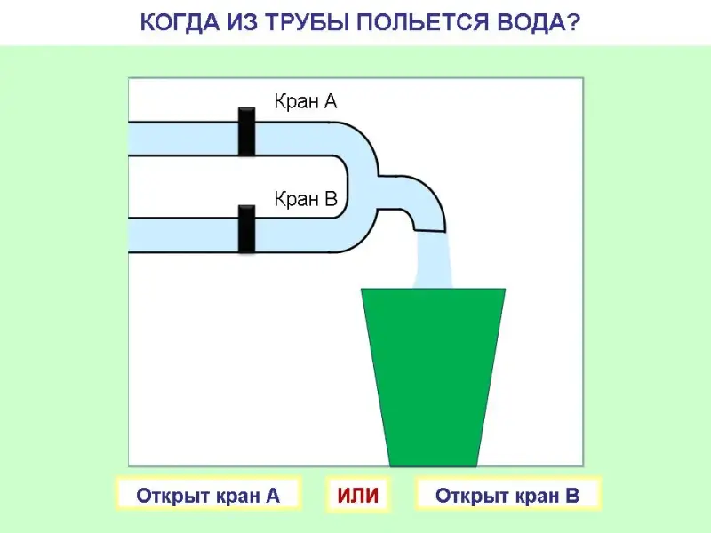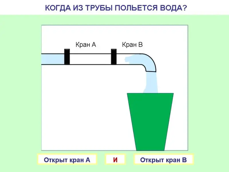 Предлагает рассмотреть слайд 3. Когда из трубы польется вода? Когда оба крана открыты. Составьте логическое высказывание по данной картинке. Какой союз в нем встретился? Высказывания, которые мы до сих пор рассматривали, являются простыми. На основе простых высказываний могут быть построены составные высказывания. Цель урока: познакомиться с логическими операциями, с помощью которых можно составлять сложные высказывания и научиться определять их истинность. |