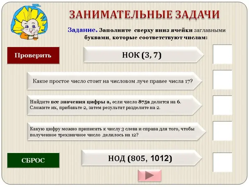 - закрепят теоретические знания: определения делитель, кратное, простые и составные числа, свойства и признаки делимости, алгоритмы нахождения НОД и НОК;